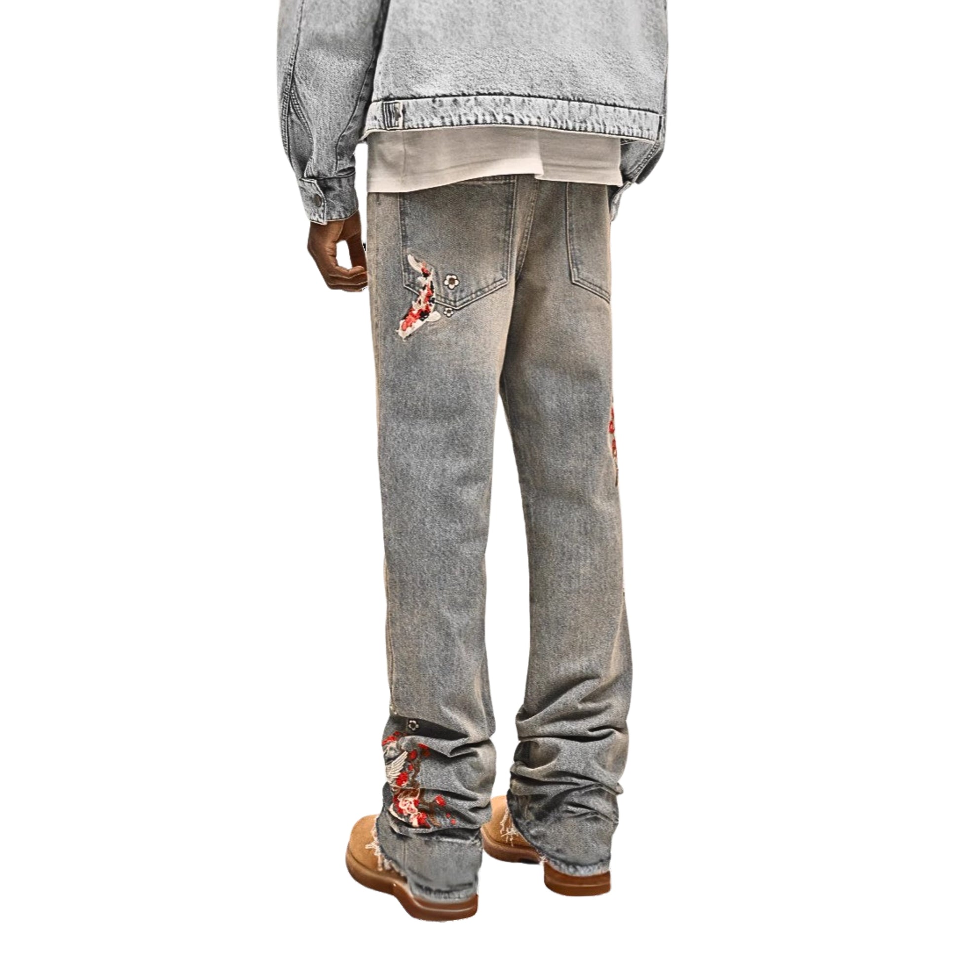These vintage wash jeans have detailed floral embroidery with birds running down the leg. They’ve got a bold look but still feel easy to wear. A clean piece that makes your fit stand out without trying too hard.
